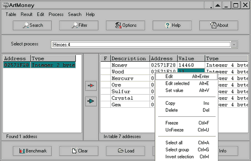 ArtMoney is a cheating program you can use for all games. ArtMoney can make a troublesome game easier to win by helping you find the memory address where a desired quantity (like amount of money) is located so you can change that quantity. In spite of its title, ArtMoney actually allows you to change any quantity specified in a game, whether it be dollars, bullets, swords, or health points. The program finds a hex address based on the input parameters you set and prints these addresses with their corresponding values. For example, if your character has 1,431 dollars, ArtMoney searches and displays all memory addresses containing the value of 1431. Of course, as there can be hundreds of memory addresses displayed after a simple search, you will need to filter this addresses.