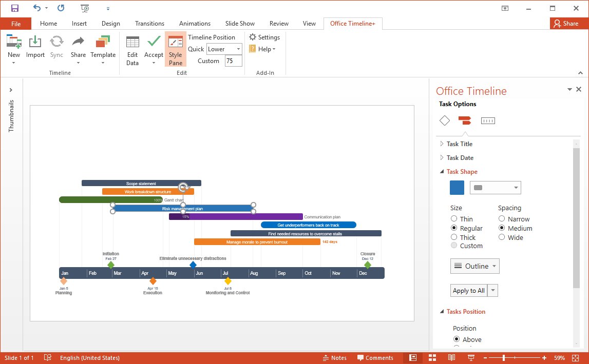- Improve project communication with stunning PowerPoint timeline slides that can be viewed, edited, and shared by anyone who has Microsoft Office. Office Timeline’s seamless integration into PowerPoint makes it simple to present project plans or Gantt charts in a way that important audiences expect – and easily understand.