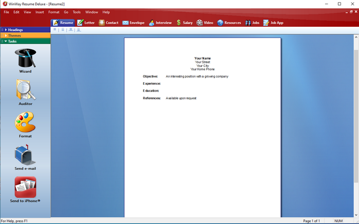 WinWay Resume Deluxe is the right tool for the job, it helps you write, format and check your resume for you. With WinWay Resume Deluxe, you will easily find a job, prepare your resume, excel in an interview, and maximize your salary. Perfect for any career situation: career advancement, career change, return to the job market, working from home.