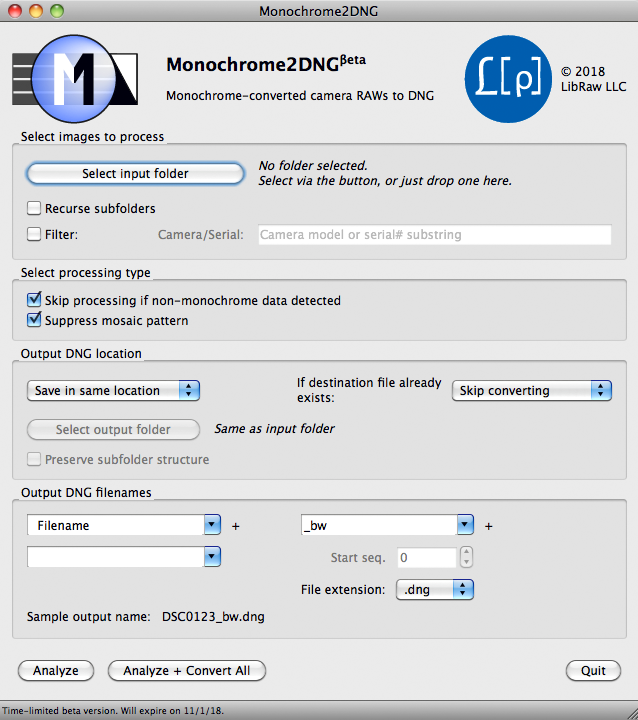 Monochrome2DNG — the Missing Application for Сolor Сameras Сonverted to Black and White. The Monochrome2DNG utility is intended to streamline using cameras converted to monochrome and avoid artifacts and loss of resolution caused by (now, unnecessary) demosaicking which would otherwise be applied.