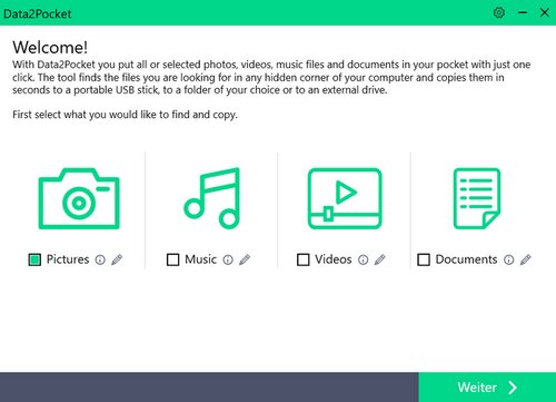 Data2Pocket backs up multimedia files to an external storage medium at the push of a button. To do this, it first searches the entire computer for pictures, videos, and songs and copies all the files found to a selected USB stick or, if necessary, to a larger USB hard drive.