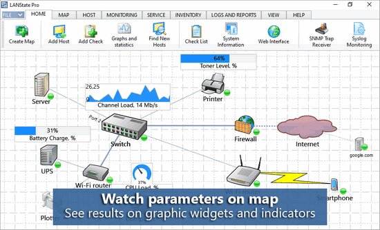 - Vivid LAN representation with displaying host states and widgets indicating monitored parameters in the real time.