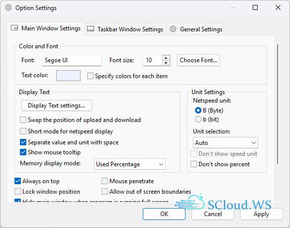 TrafficMonitor is a network monitoring software with floating window feature for Windows. It displays the current internet speed and CPU and RAM usage. There are also other capabilities like an embedded display in the taksbar, changeable display skins, and historical traffic statistics.