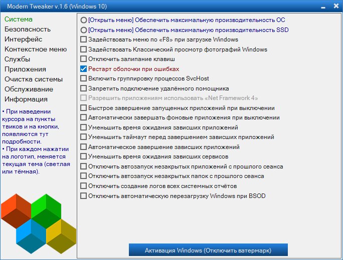 Modern Tweaker (ex. KPOXA Tweaker by adnext) — a software shell for Windows tweaks that will allow, even an inexperienced user without knowledge and labor, to increase the performance of Windows.