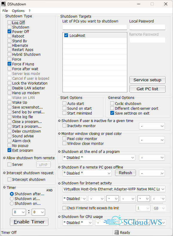 DShutdown supports more than just standard shutdown options, there are options relating to «pure» shutdown (such as the «force after wait» option which causes a forced, but 'clear' shutdown). There are monitoring options that allow you to shutdown a PC after a particular application terminates (useful at the end of compressing several files). There are also options to shutdown a PC when Internet traffic reduces below a particular data-rate (useful to shutdown a PC when it has finished a large download).