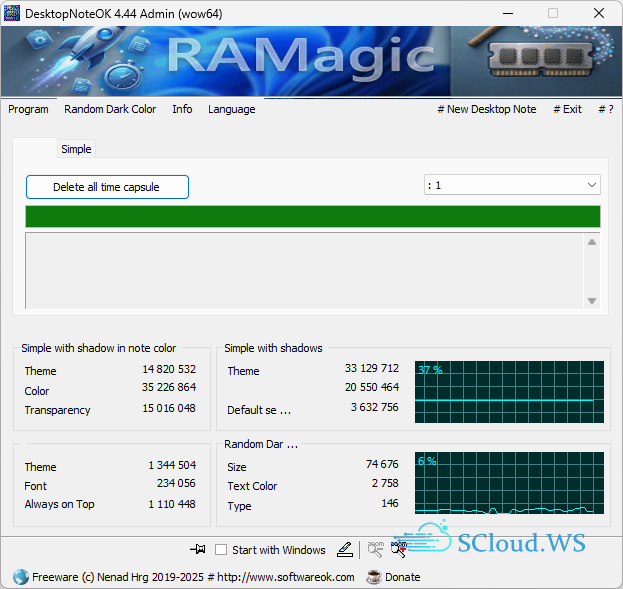 RAMagic is a compact, portable house-elf for your RAM. It analyzes running processes, clears unnecessary working sets, and makes reserved standby cache available again. Features live memory monitoring, before/after comparison, and administrator mode. Ideal for gamers, designers, and anyone wanting to squeeze more performance from their PC.