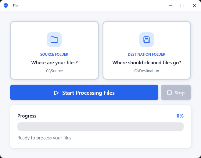 Drag your source and destination folders into MetaScrub and click Start. Process individual files or thousands at once. Works with photos, videos, PDFs, Word documents, Excel spreadsheets, PowerPoint presentations, and more. View metadata before removing it. See exactly what's hidden in your files. Copy details for your records. All processing happens on your computer and files never upload anywhere.